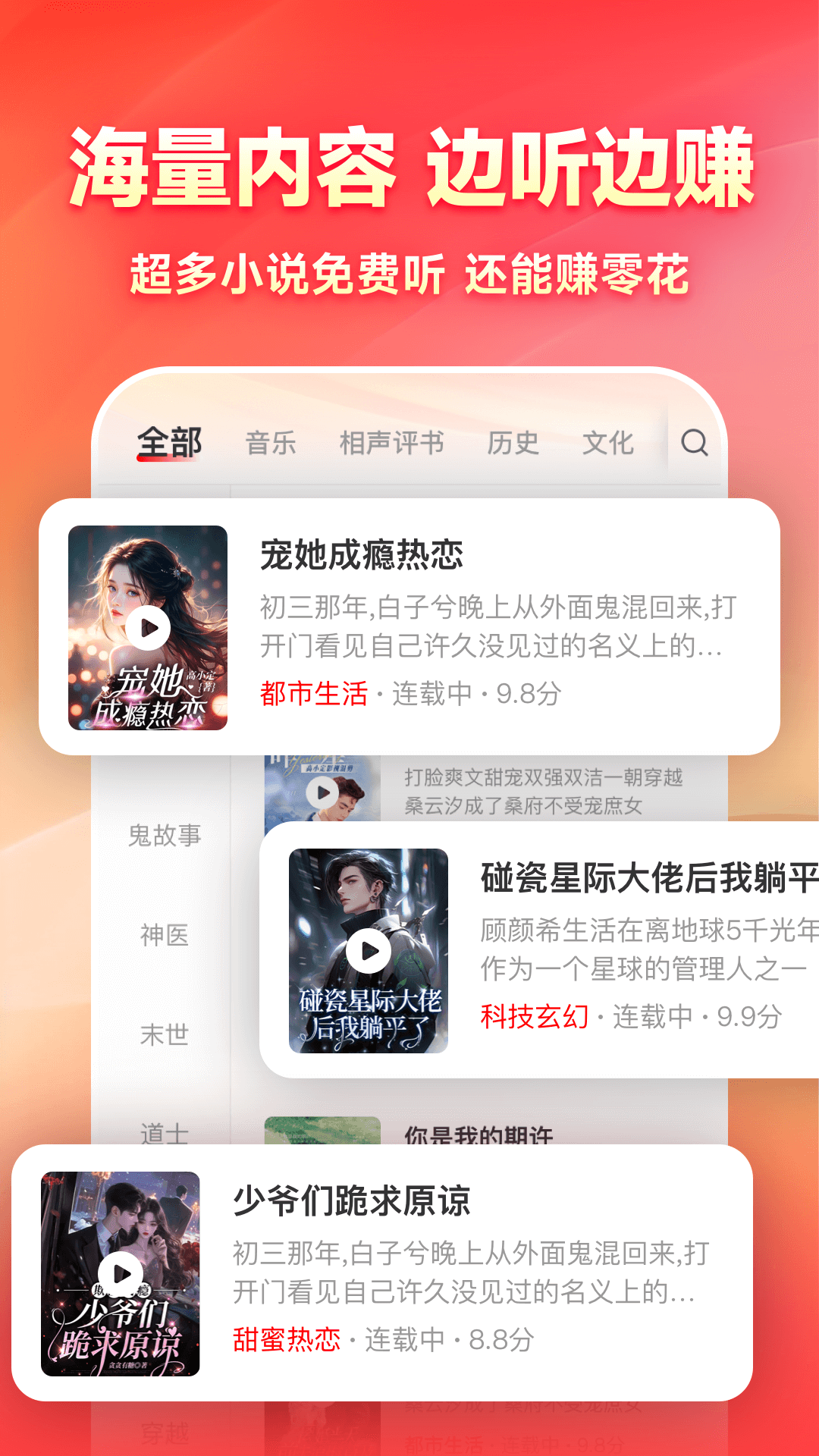 热门小说、悬疑探案、情感故事……免费听的同时自动计入收益;