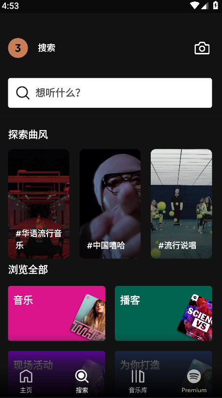 1、启动Spotify,点开底部导航栏里的“搜索”页,再轻触顶部的搜索框。