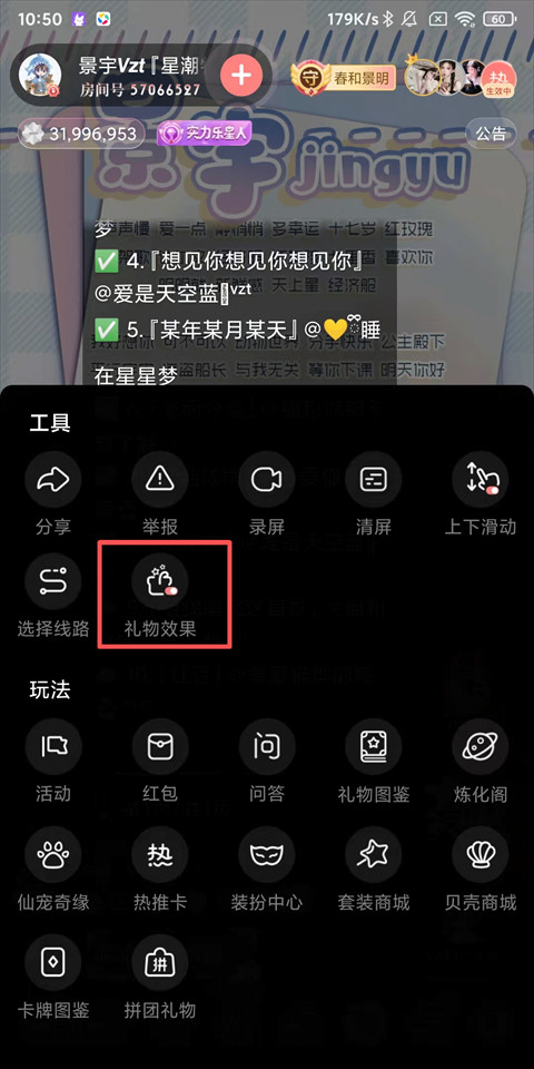 3、弹出来的选项里有个“礼物效果”,点它就能关闭动画特效,想重新打开的话再点一次就行。