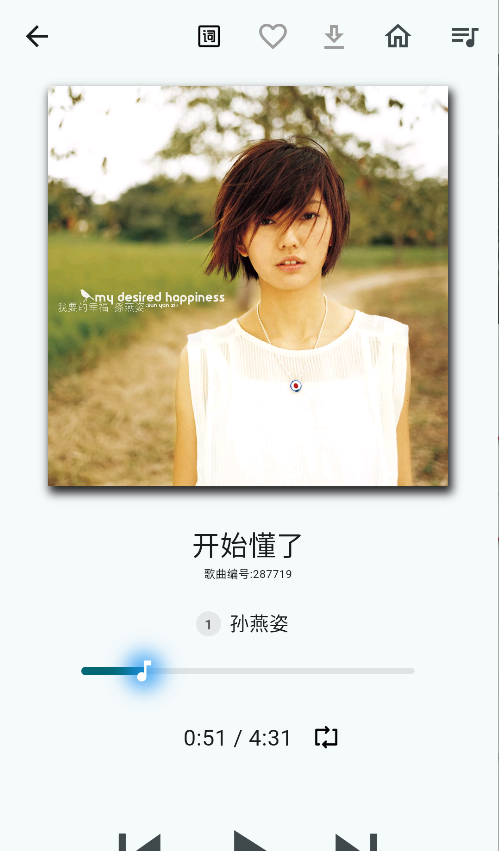 5、进入详细界面后功能很全:右上角带“词”字的按钮能调出歌词;点个爱心就是把歌收进收藏;下载图标能帮把歌存到本地;想回主页就戳那个小房子形状的键;右上角三条杠的菜单则是用来查看当前播放列表的