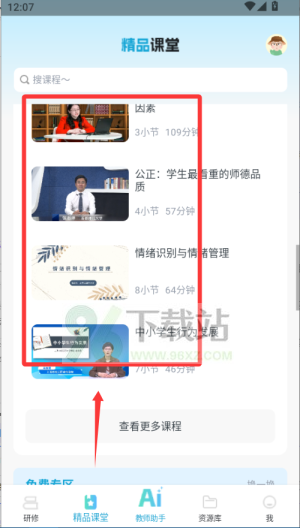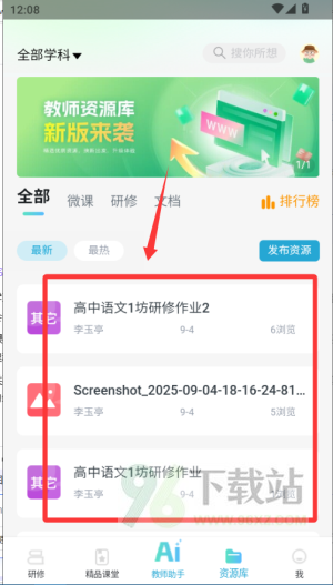 在“资源库”下载课件、习题等资料;加入研修小组后,可与其他教师交流心得、分享笔记,系统还会智能推荐相关优质内容。