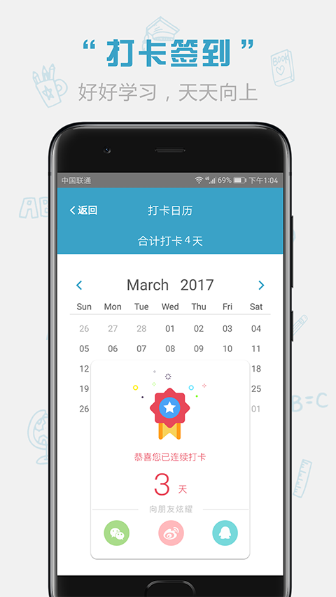 3、通过打卡日历、进度统计等机制,形成学习监督与激励,帮助用户培养长期坚持的习惯。