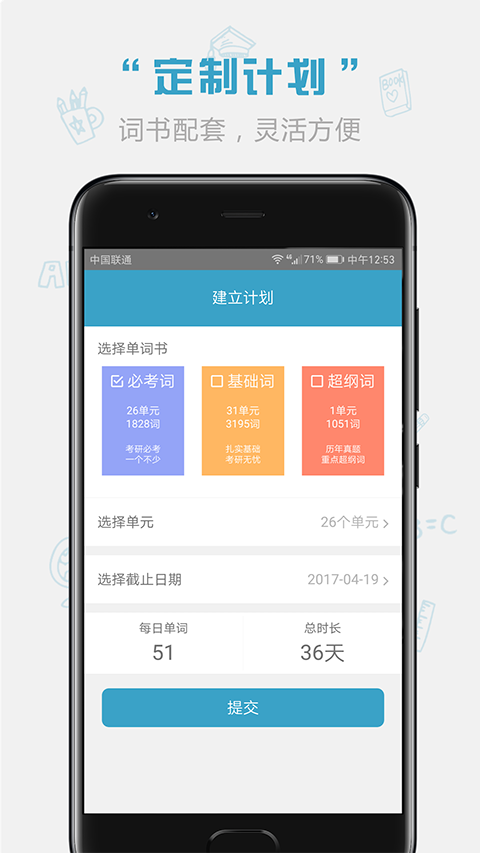 1、打开App后,可根据自身基础,在“计划”中设置每日要学习的词汇单元数量。