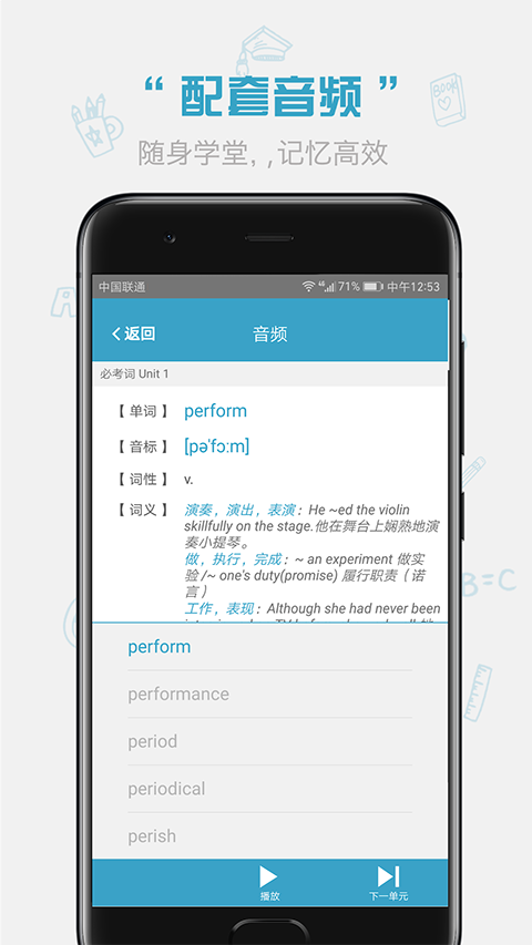 完整收录红宝书中的必考词、基础词与超纲词,并按单元划分,便于系统学习。