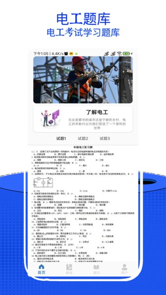 下载安装后打开电工考试小助手最新版,先选好你要考的类型,比如低压电工作业或中级电工证,系统会自动匹配对应题库。