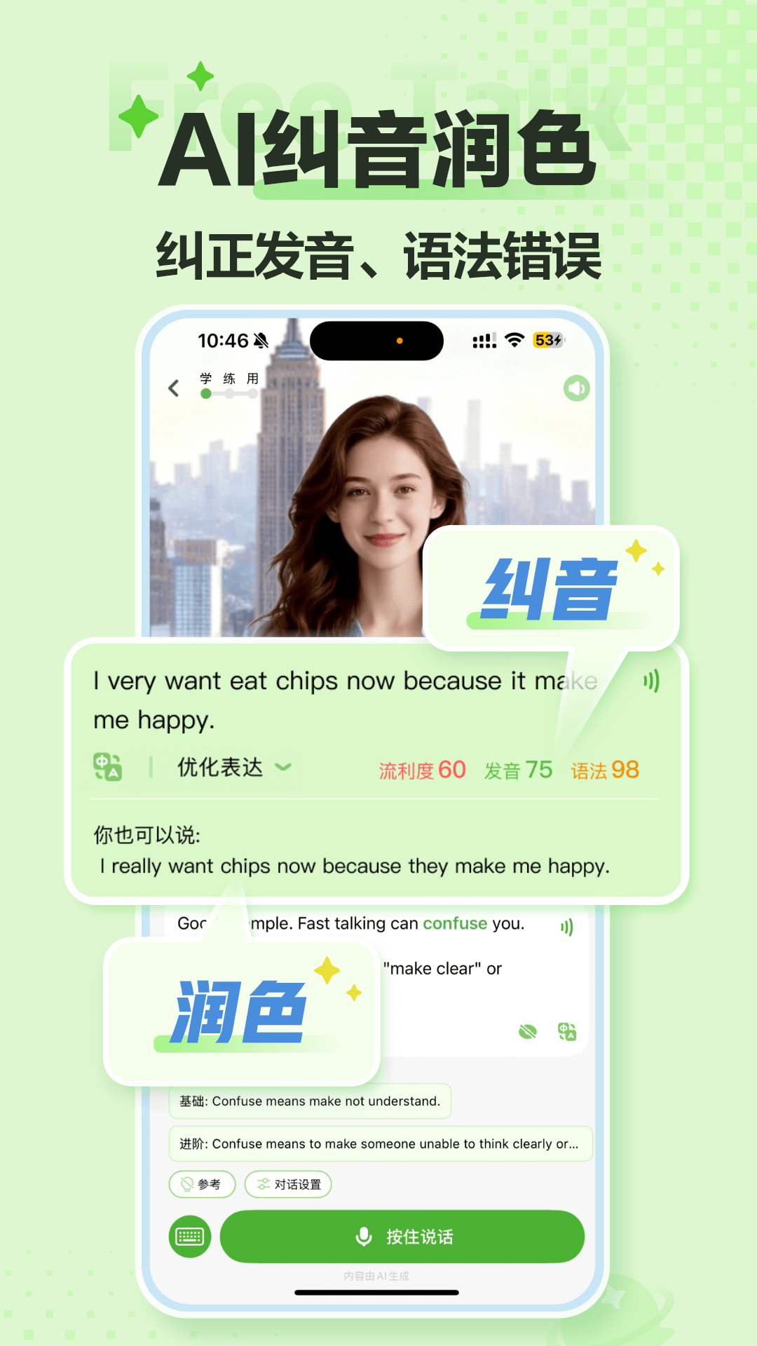 3、彻底告别开口焦虑,在与AI老师的真实互动中模拟各种社交场合,让用户在轻松氛围中自信表达自我。