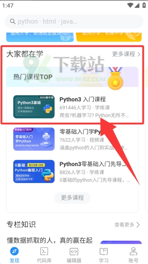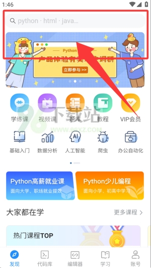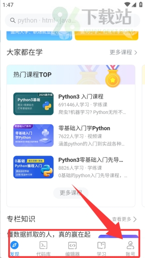 3、熟悉底部导航栏和功能入口,比如“课程”“练习”“编译器”“我的”,后续学习全靠它们;