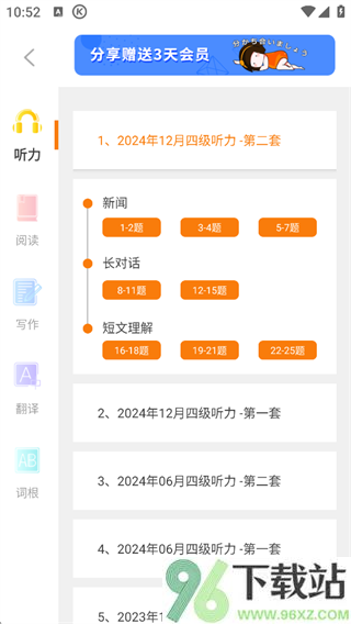 2、比如想练听力,直接点进“四级听力”入口就行,操作很直观。