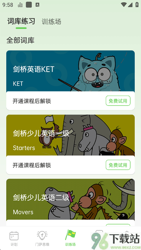 3、进入“训练场”页面,能看到不少和剑桥体系挂钩的英语词汇库,适合日常积累;