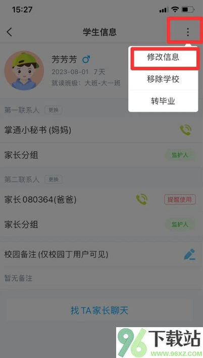 3、在学生详情页右上角,点三个小点,选择【修改信息】。
