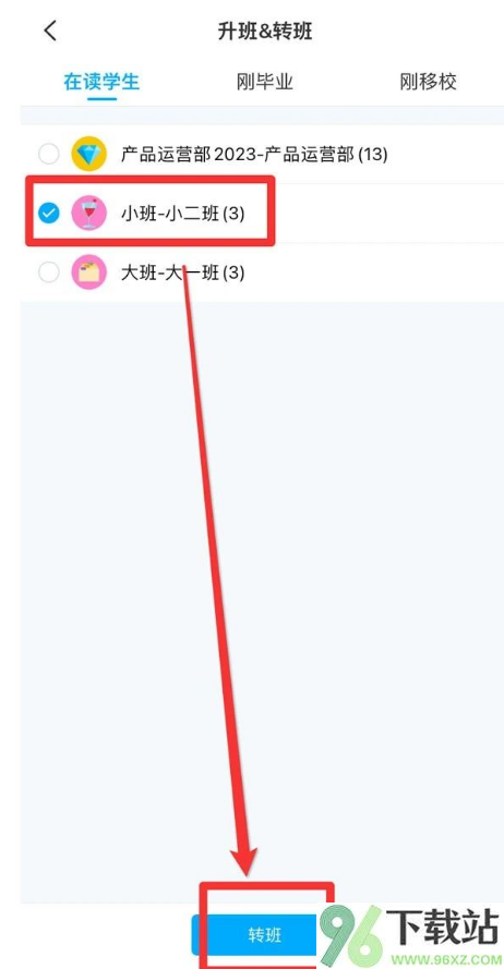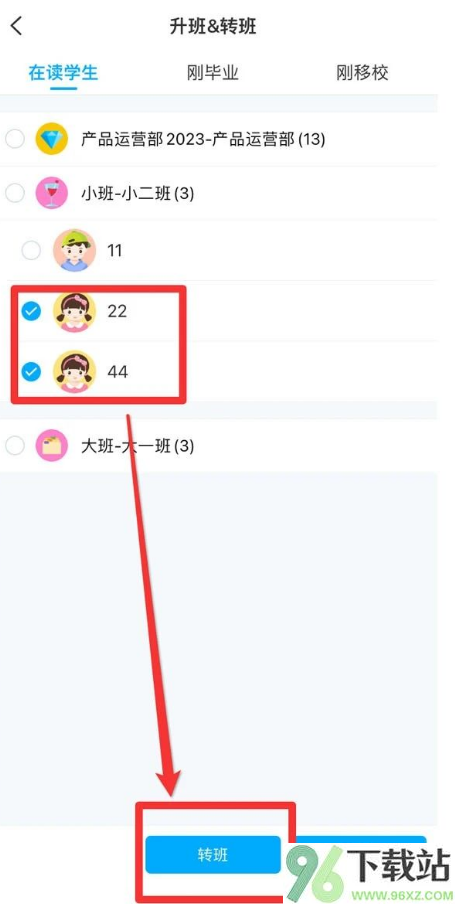 3、如果整个班都要升班,直接勾选班级名称,点【转班】;如果只是部分孩子要调,就点进班级,单独勾选需要调整的学生,再点【转班】。