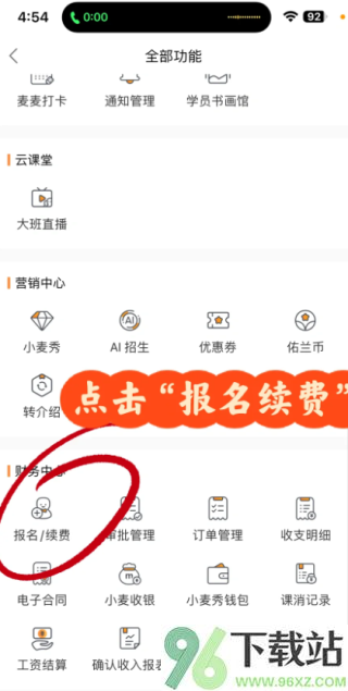 1、打开App,点底部菜单里的“报名/续费”入口。