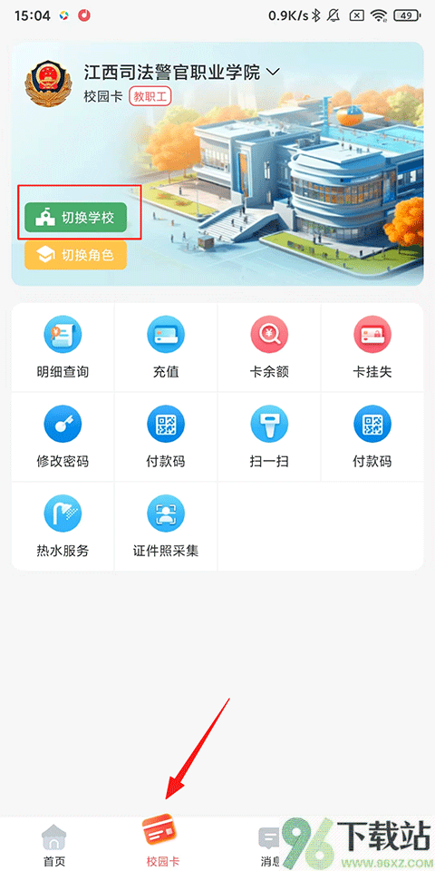 1、进入易校园App,点开【校园卡】页面,找到底部的【切换学校】选项;