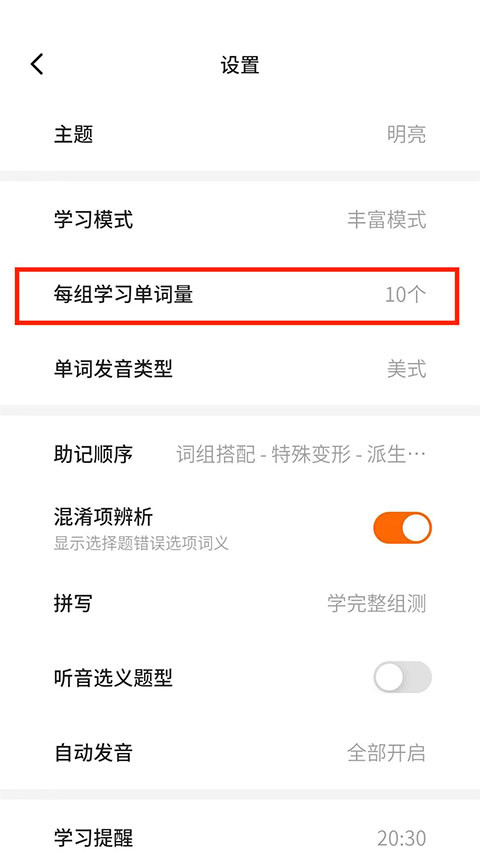 3、在设置菜单里,找到“每组学习单词量”这一栏点开