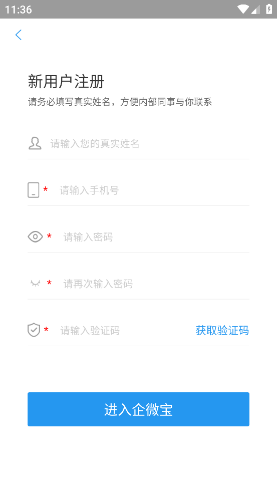 1、下载好软件后先注册一个企业账号,最好是用老板的手机号注册,方便以后分配员工的操作权限。