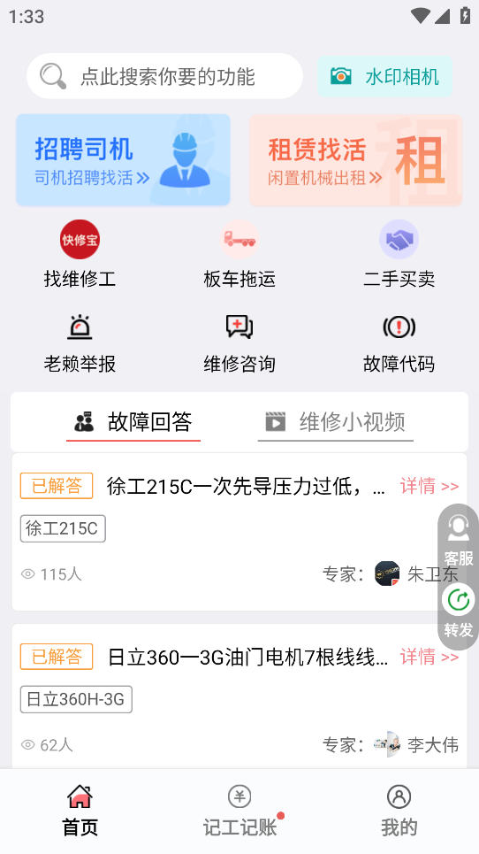 3、遇到设备故障时直接点击维修板块,系统会根据你的位置和车型匹配附近的维修资源或配件。