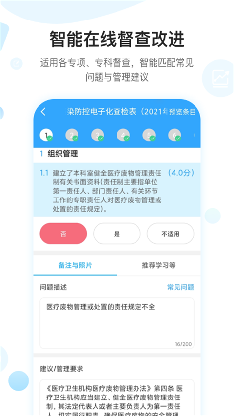 内置最新院感检查表,按科室自动推送,逐项拍照上传,缺项实时标红。