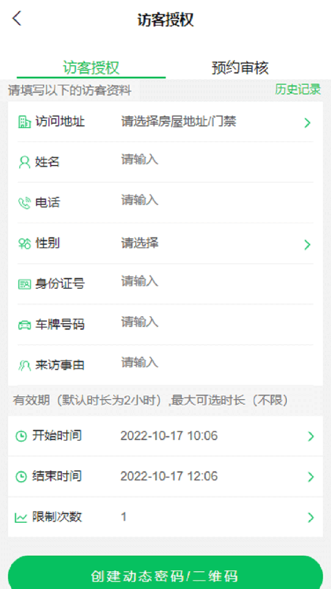 2、访客授权:首页→访客授权→填写姓名+电话+时效→生成二维码/密码→微信转发给对方。