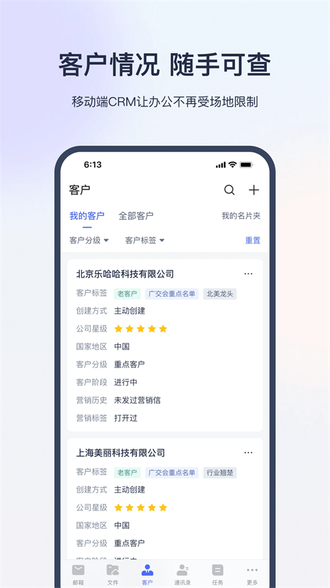 客户信息、往来邮件、跟进记录随时随地查,一键写信、团队共享,商机不漏,客户背调也方便。