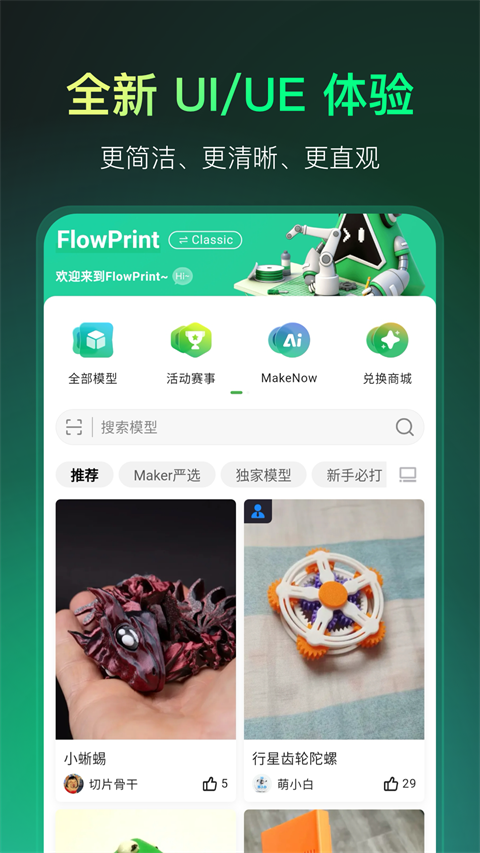 创想云3d打印App就是现在很多3D打印爱好者、设计师、手办党、学生、甚至小朋友爸妈都爱用的那个“创意打印小宇宙”,以前想打印个手办、浮雕、模型,得自己切片、调参数、盯着机器好几个小时,稍不注意就废件,现在打开这个App,模型库海量到随便逛,免费的、促销的、赛事热门的应有尽有,从动漫周边到实用家居、cosplay道具、机器改装件全覆盖,特别爽的是云切片功能,手机直接上传文件或选模型,远程切片发给打印机,自己出门逛街机器在家自己打,打印过程还能实时监控、延时摄影录下来,完工后直接分享朋友圈,仪式感拉满,新手小白也完全不怕,官方教程、视频指导、社区互助全都有,设计师上传模型还能拿积分、打赏、自主定价赚钱,简直是玩着玩着就变现了,很多人用下来都说,以前打印像干活,现在像玩游戏,创意无限、操作简单、社区热闹,3D打印的乐趣直接翻倍。