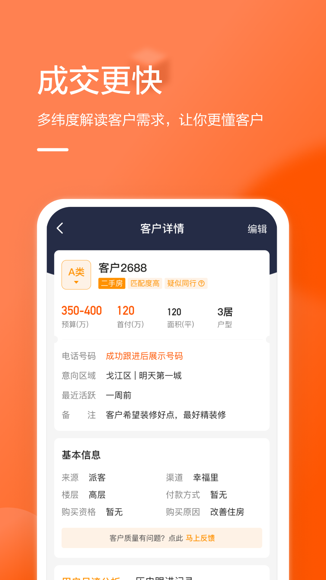 软件能从多个角度去琢磨客户到底想买多大的房子以及他们的付钱能力,帮咱们业务员在谈单的时候能说在点子上。
