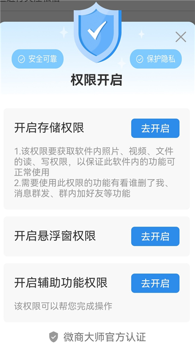 7、这时候会弹窗让你开权限:存储、悬浮窗、辅助功能,一个都不能少。点右边的【去开启】弄好后,机器就开始自动帮你跑业务啦。