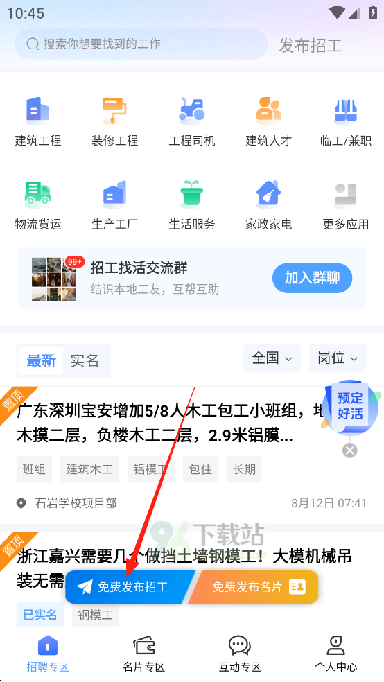 1、打开App并登录账号,在首页点击醒目的【免费发布招工】按钮;