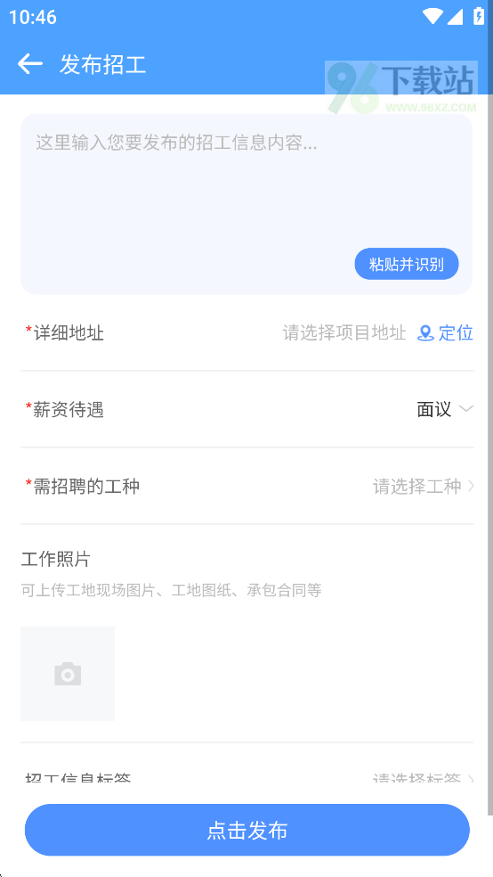 2、填写工种、薪资、工作地点、工期、技能要求等信息,确认无误后点【发布】,岗位立刻上线展示。