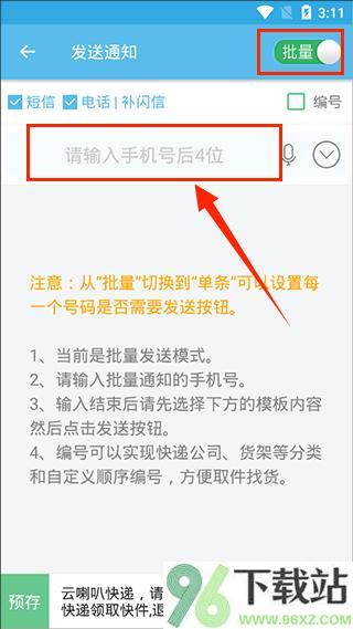2、在号码框里填上收件人的手机号,要是有一堆号码,记得勾上“批量”选项。旁边有个话筒图标,点一下就能用语音输入号码,省得打字。