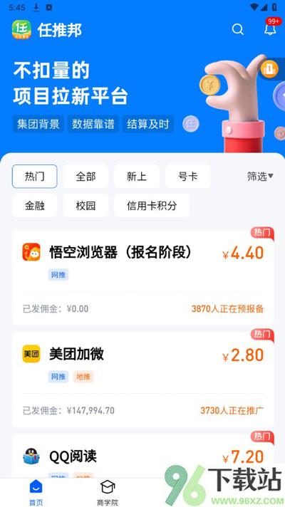 任推邦app是BD邦自家推出的一款推广管理工具,主要帮各类App拉新用户。它把项目分发、数据追踪、团队裂变、人员管理和佣金结算这些环节都整合在了一起,目前已经有超过20万推广渠道在用。像百度极速版、夸克、UC、悟空浏览器这些热门项目,它都是一级合作方。不管是大城市还是小县城的地推团队,都能靠它解决统计混乱、结算延迟、返佣偏低这些痛点,实实在在提升地推效率。如果你有产品想推广,可以在平台发布任务,自然会有推广员接单;如果你想赚点外快,下载App接任务就行,做完就能提现,流程挺直接的。