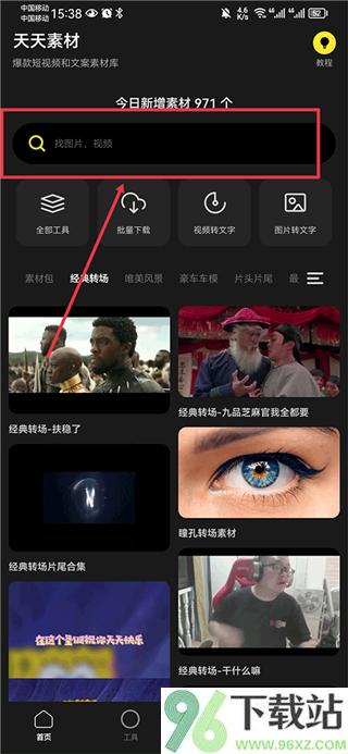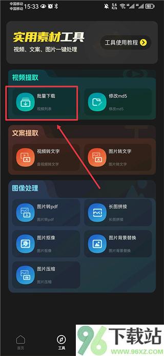 切回天天素材app,进到工具区,找到“批量下载”这个选项点开。