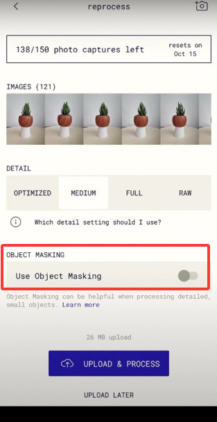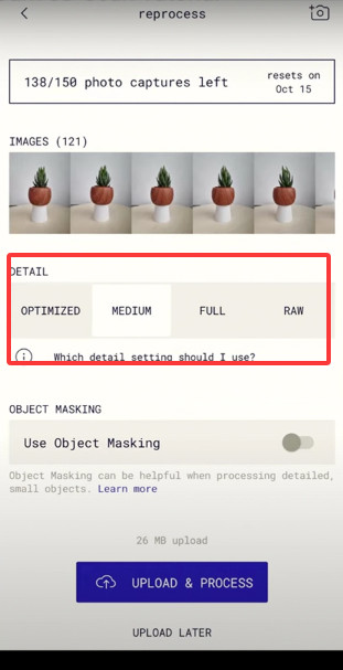 3、拍完几十张不同视角的照片后,系统会自动处理,这时你可以根据需要选择输出模型的精细程度。