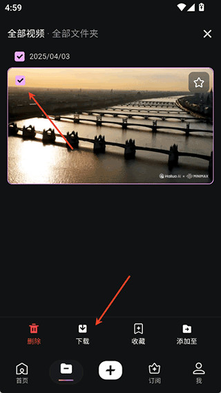 2、挑中你想保存的视频,接着点底部或顶部出现的下载按钮就行。