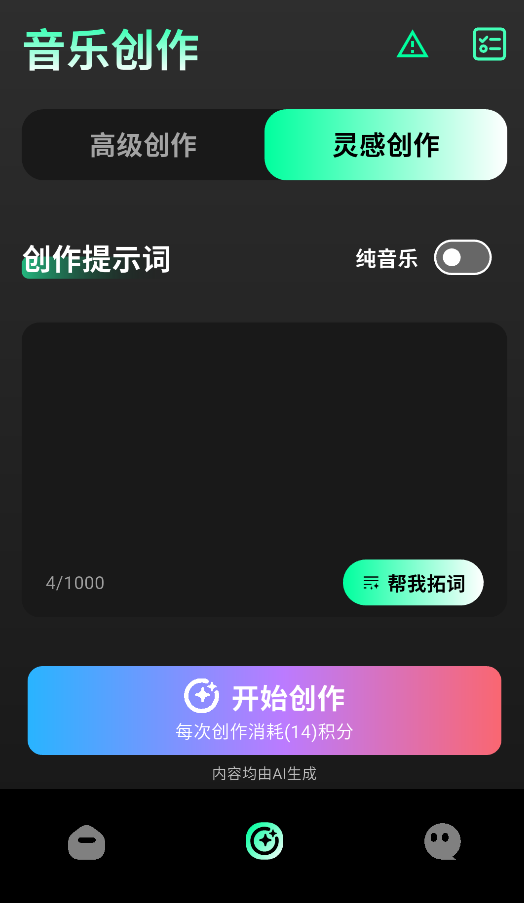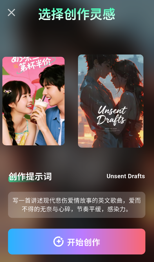 5、在输入框里写下你的创作想法,比如“欢快的夏日电子风,带点合成器音效”,然后点“开始创作”,系统就会自动生成音乐。