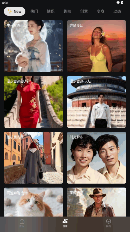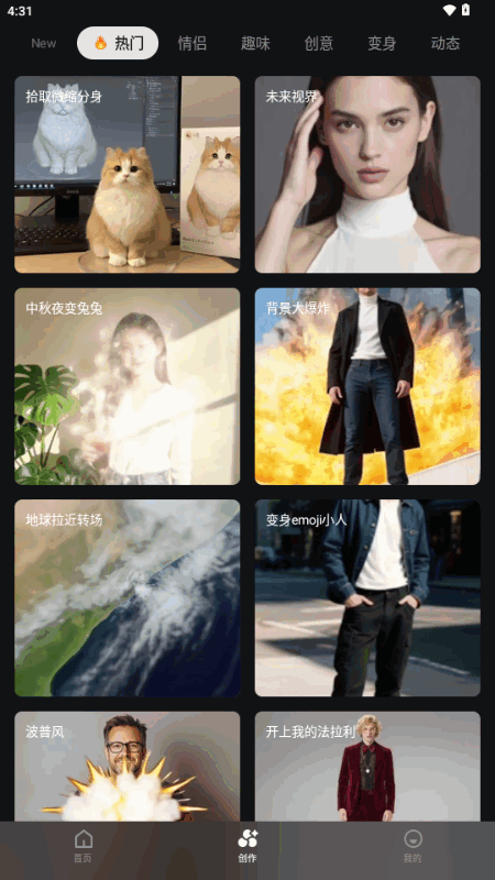 2、点击界面底部的创意栏目,这里汇聚了多种创意视频模板,看中哪个可以直接一键套用。